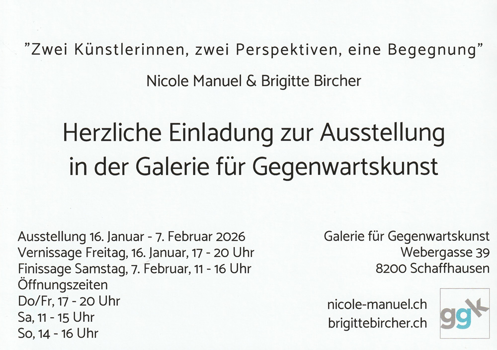 Begegnung, 16.01. – 07.02.2026, Galerie für Gegenwartskunst, Schaffhausenvon in Ausstellung, Uncategorizedan Veröffentlicht am Ausstellung Brigitte Bircher & Nicole Manuel Vernissage Freitag 16. Januar 2026, 17.00 – 20.00 Uhr Laudatio Stefan Marti